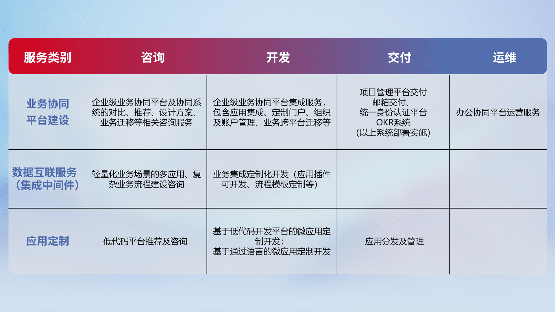 针对钉钉、、企微、、、IDaas等平台级产品提供产品的规划、、方案、、交付、、定制化开发等服务,,,,实现如统一协同办公、、、、智能客户服务、、混合会议管理、、智能数据查询、、等业务场景,,实现数字化转型。。。