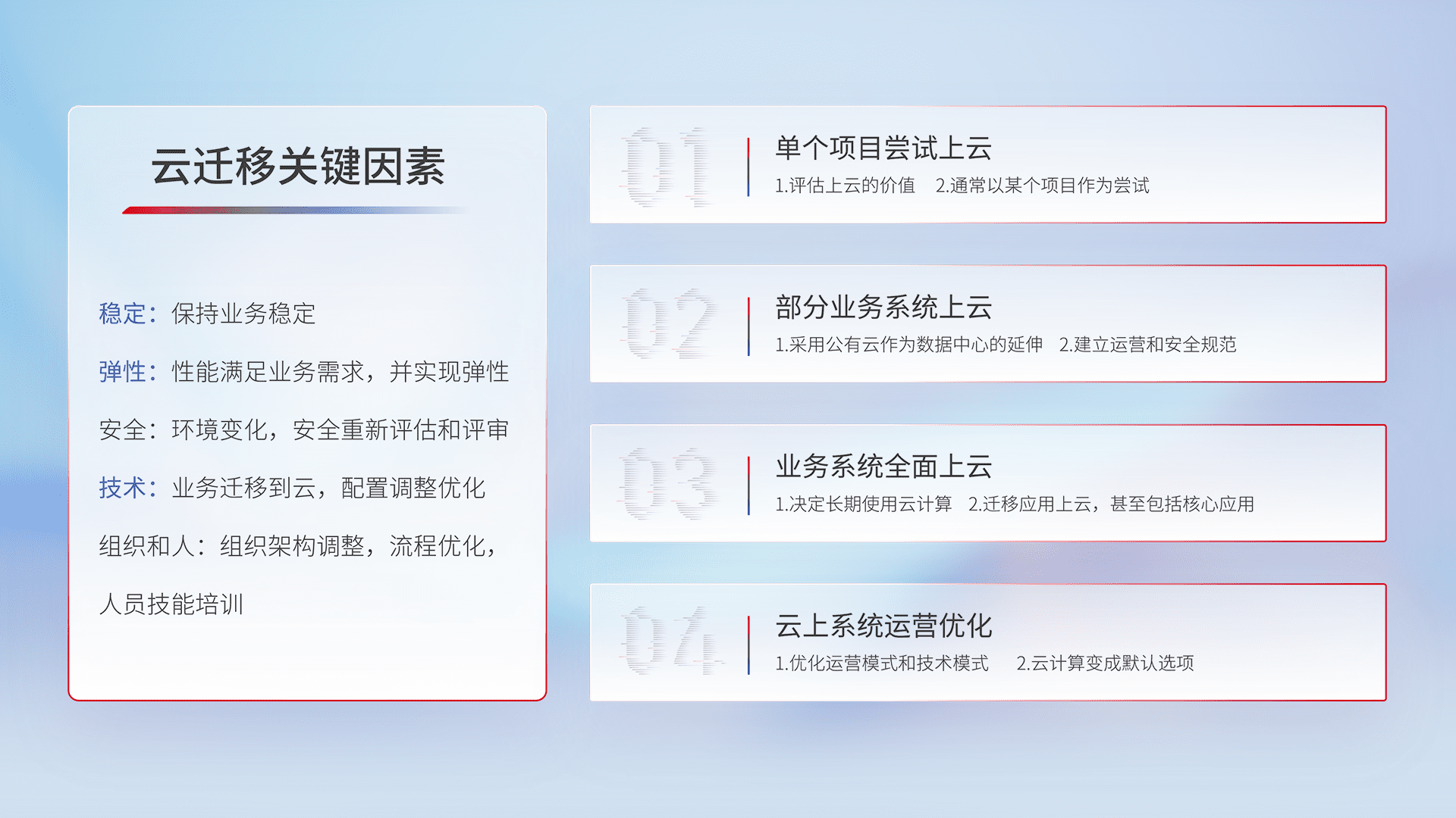 结合实际业务,,,从规划设计、、、、云平台选型、、云原生改造、、、数据迁移、、、集成交付,,迁移全过程为客户识别最佳上云路径,,做好风险识别管理,,,设计网络架构、、身份权限、、安全审计合规、、操作审计、、日志审计、、、监控告警策略、、多站点容灾设计等,,,对云上基础设施进行整体规划,,提升IT治理水平,,,以满足弹性、、、高可用、、、、高性能的需求。。。