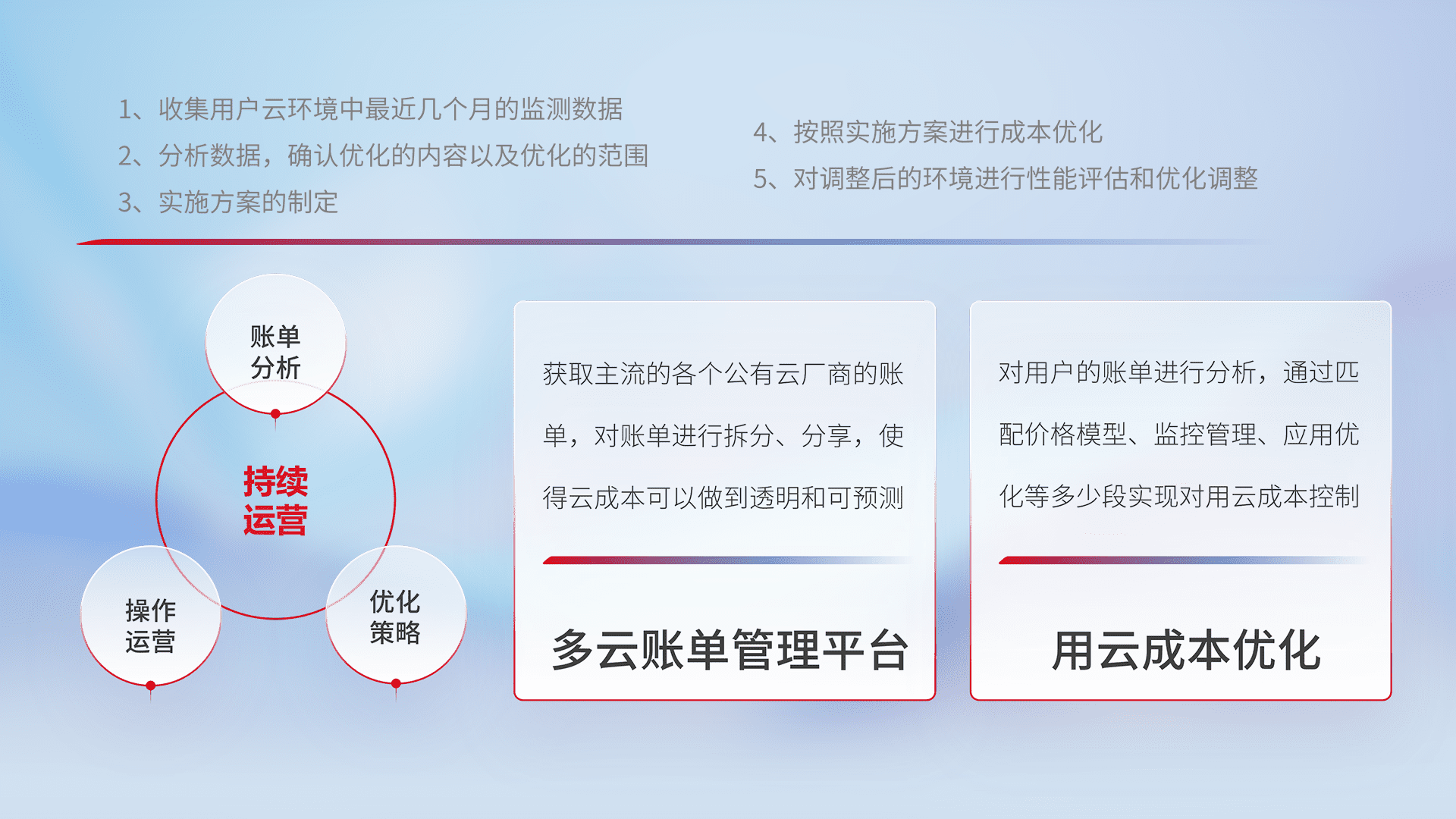通过多云纳管,,,以统一的资源数据模型把客户的云资源进行抽象和封装,,进而实现对多云资源的统一操作,,保障云资源管理的可靠性、、、稳定性与可用性。。。量身定制化运维内容,,配置、、、、开发运维、、、补丁管理、、、备份、、监控、、认证和访问管理、、、、审计和日常巡检等,,,,保障在用云过程中的可靠度,,,,稳定度以及高可用率。。。